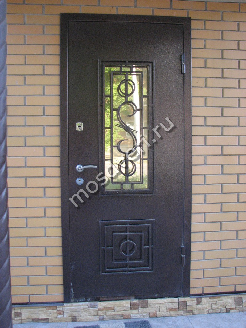 В металлических входных дверях мы используем только безопасное стекло - триплекс или закаленное. Такое стекло выдерживает удары и при повреждении не образует острых осколков. Для частного дома рекомендуем модели с энергосберегающим стеклопакетом - он сохраняет тепло внутри. Стальная рама вокруг стекла имеет декоративное напыление под бронзу или хром. Уличная дверь со стеклом может комплектоваться зеркалом с внутренней стороны. Цена зависит от типа стекла и размера вставки.